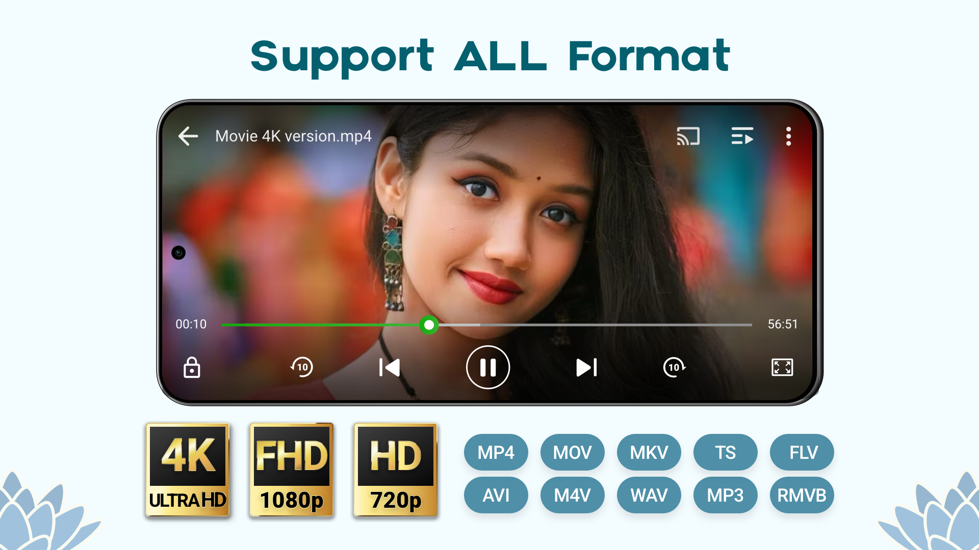 HD Video Player supports all formats such as MP3, MP4, MOV, 3GP, MKV, TS, FLV, RMVB, etc., along with the best MP4 media player. You can watch any video format without any disruption. Also, with this video player, you can enrich your viewing experience with its many features..